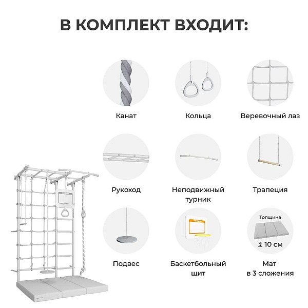 + кольца, канат, трапеция, диск-качели, баскетбольное кольцо в комплекте;